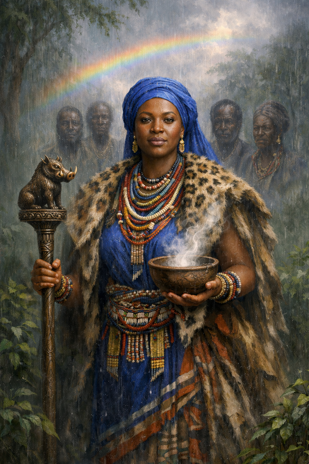 In many African cosmologies, nature is not a resource to be exploited, but a living, ensouled reality to which humans belong. The Rain Queen stands as a bridge between community and this animate world, mediating the conditions for life through reverence, ritual, and relational responsibility.