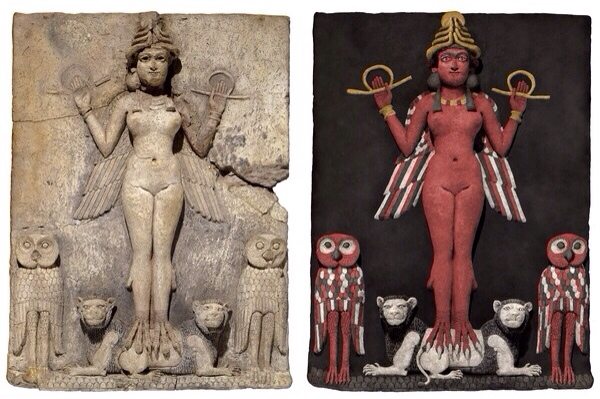 Image credit: "Queen of the Night" Relief (left) and color reconstruction (right), 1800-1750 B.C.E., Old Babylonian, baked straw-tempered clay, 49 x 37 x 4.8 cm, Southern Iraq and reconstruction © Trustees of the British Museum